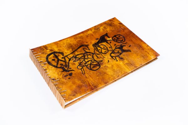 Defter, kapak kaplama kâğıtları demir pası suyunda renklendirilmiş, ön kapak Eski Türk kaya resimlerinden seçilen figürler ile süslenmiştir. 120 gr beyaz 8 adet folyo Belçika cilt tekniği ile ciltlenmiştir.